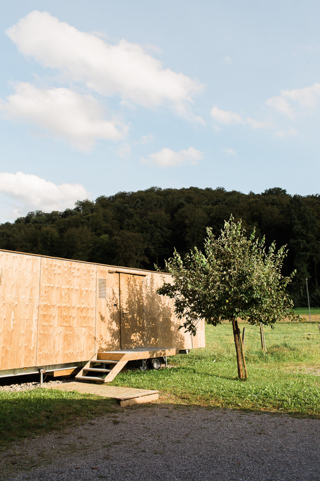 Wir arbeiten in unserem selbstkonstruierten und gebauten Bürowagen. Unser Arbeitsplatz ist mobil – der Anhänger ist strassentauglich. Der komplette Aufbau besteht aus einer Holzständerkonstruktion, welche wir innen durchgehend mit Fichte verkleideten. Für die hinterlüftete Fassade und das Dach wählten wir kesseldruck imprägnierte Kertoplatten.