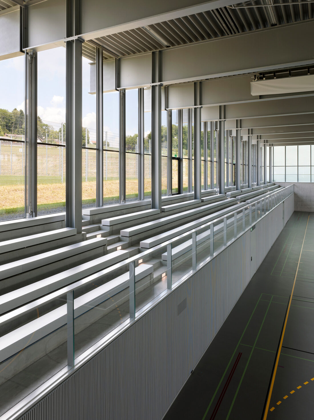Direkt auf den Schweissträgern liegt zur Aussteifung das verstärkte Dachblech. Das Dach wird durch die Bleche und die eingespannten Stützen gegen horizontale Erdbeben- und Windkräfte stabilisiert.